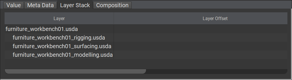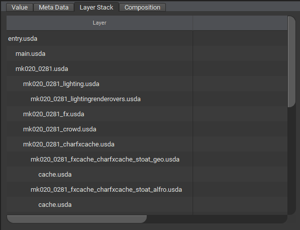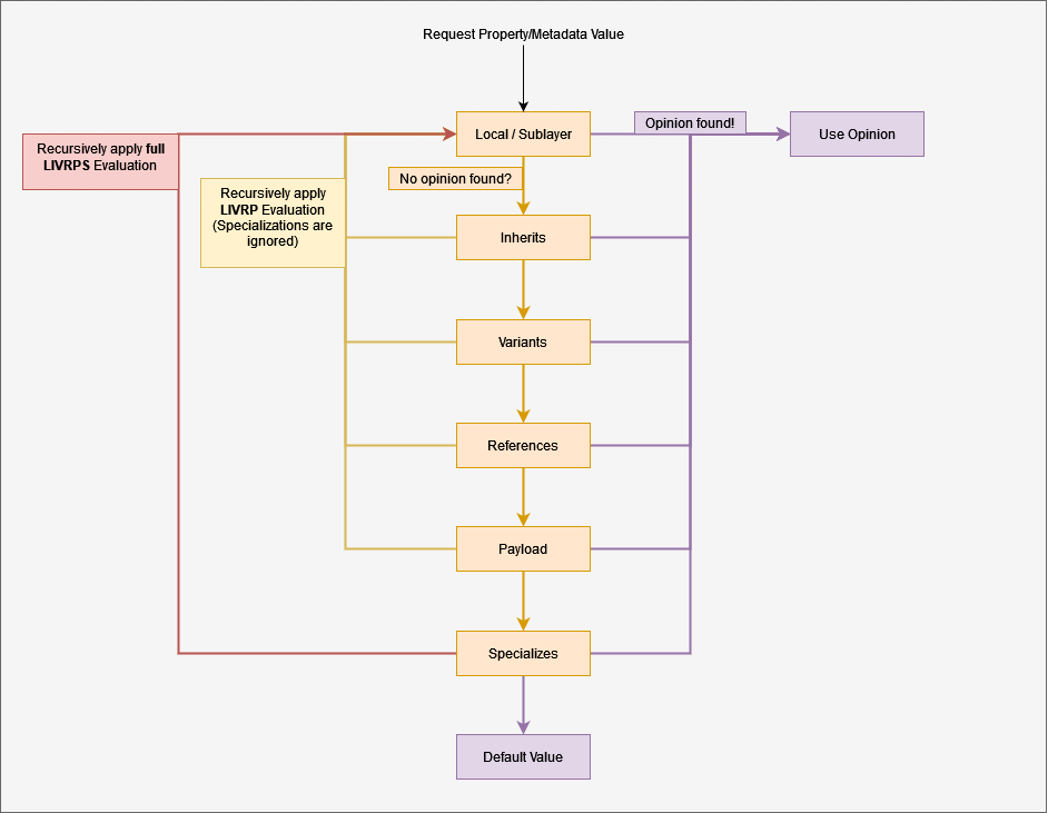 這個階層式的清單,可視作一個由上而下遞減檢索的結構 (top-down stack)。當 USD 需要對指定的屬性 (property) 或 metadatum 進行 opinion 衝突排解時,系統將遵循上方羅列的順序位階,由高至低逐一掃描各層 composition arcs。掃描途中一旦發現其中包含有效定義的 opinion,該往下的探尋流程便會立刻中斷,直接採納並沿用該節點的值。如果直至底層整個流程都沒有搜尋到任何使用者編寫的 authored opinion,USD 將會退回採用該屬性或資料所指定的出廠預設值。