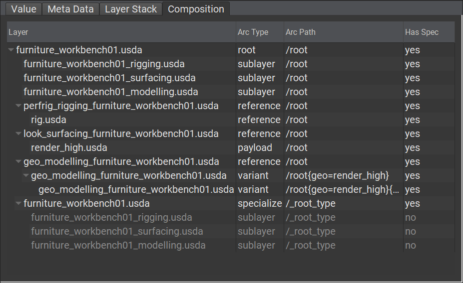 Local (本地圖層)Inherits (繼承)Variants (變體)References (參照)Payloads (酬載延遲載入)Specializes (特化)