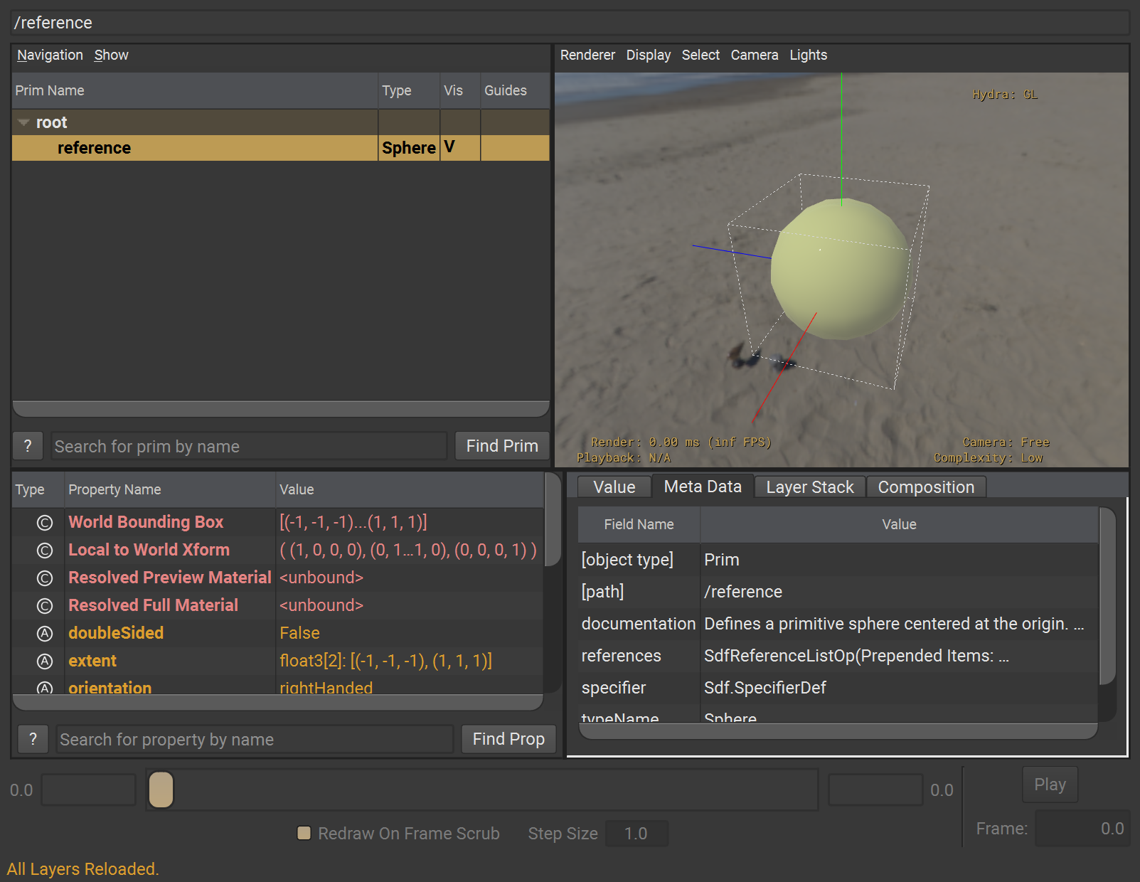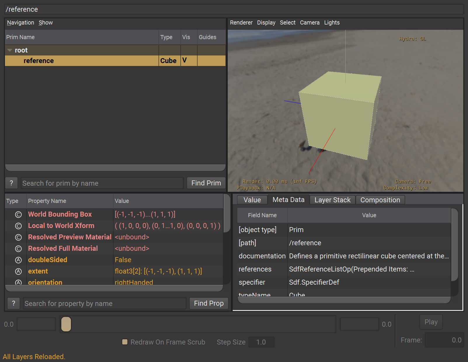 一旦我們開了個 usdview 舞台,把這張作威作福的 reference.usda 圖層攤開來檢視時我們便會驚訝地發現:唯有那個最幸運、最關鍵的 prim 得以被拔擢進它層高高在上的 Layer Stack 當中,此人不是別人,正是那位傳說中的方塊君 Cube。