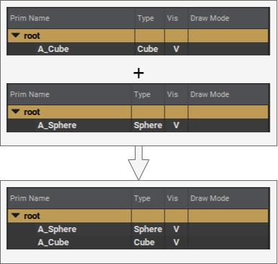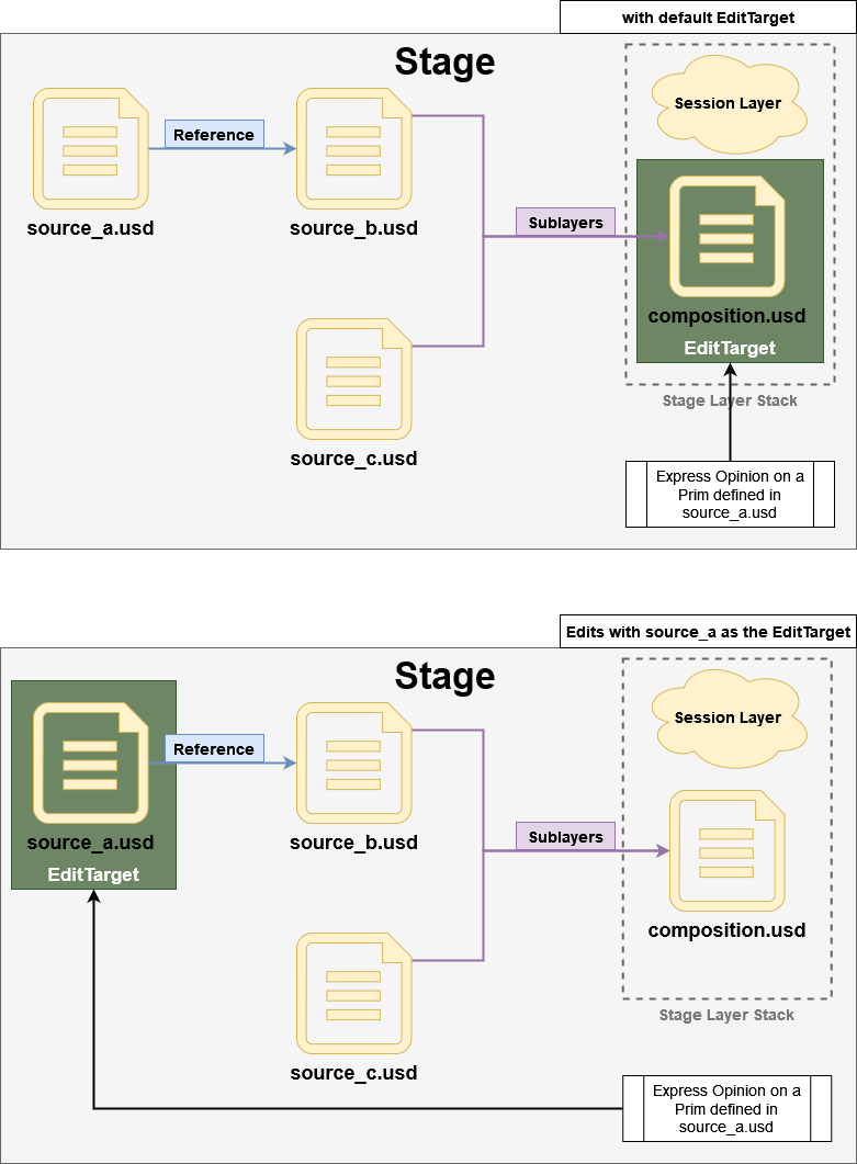 當在 stage (舞台) 中開啟並檢視某個 layer 圖層,並對場景樹 (scene graph) 進行編輯修改時,這些編輯操作在預設情況下都會被寫入並記錄於「Root Layer」(即最初建立 stage 時所使用的基礎圖層)。