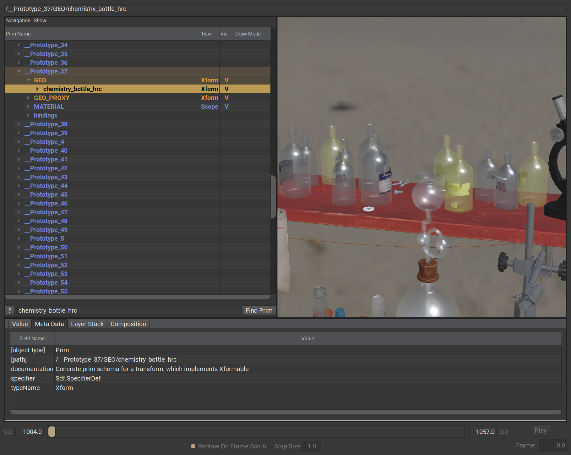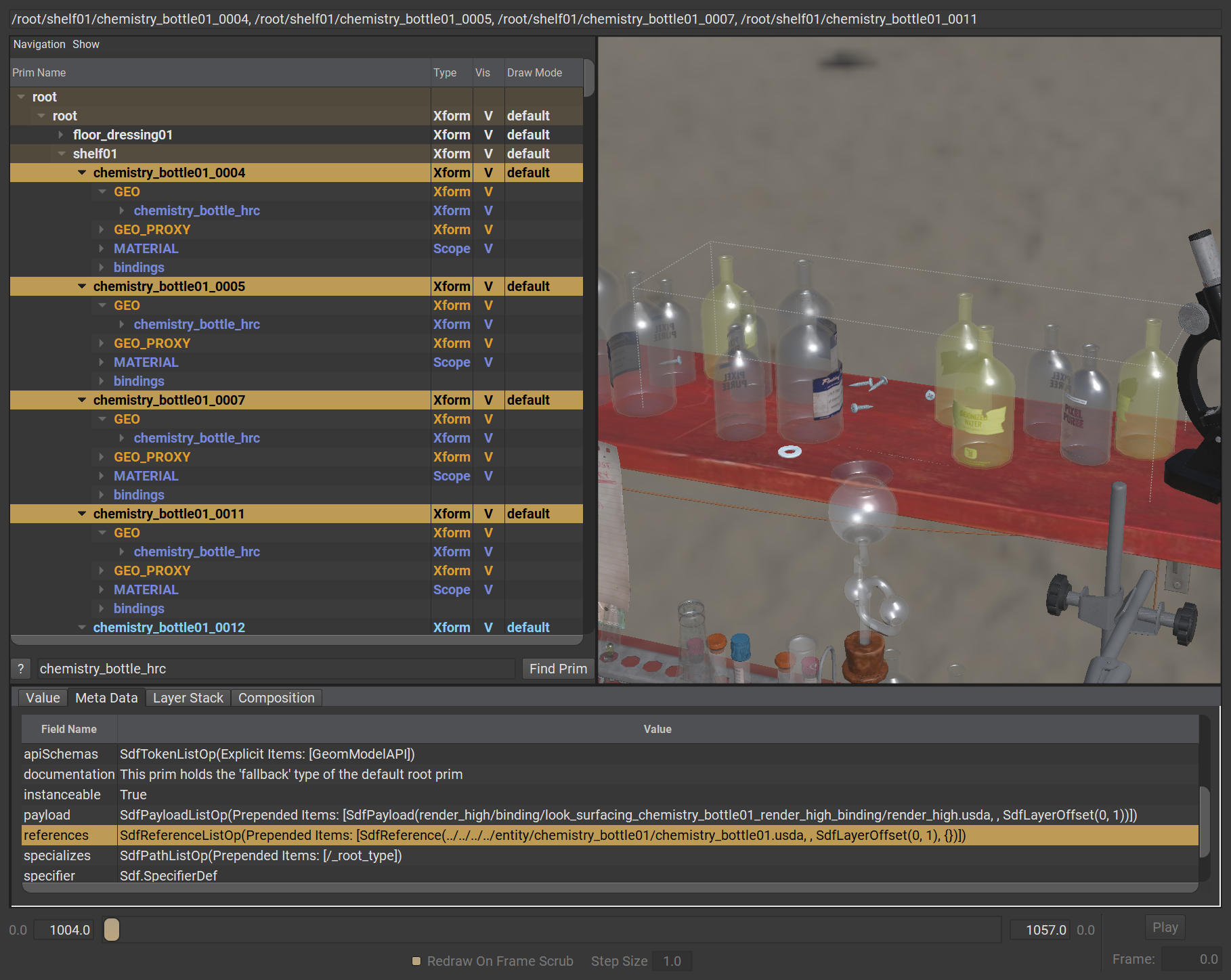 在上圖範例之中,所有被選取的實驗瓶 prims 皆是參照自 chemistry_bottle01.usda 檔案為原始樣板,且這幾筆參照同時都被加入了 instanceable = true 的中繼資料 (metadatum)。這筆標記資料告訴了 USD,它只需要針對 chemistry_bottle01.usda 合成一次對應至 __Prototype 的 prim 中即可。而在完成之後,所有指向 chemistry_bottle01.usda 的參考連線,在內部機制上實際上皆轉換成了指向 Prototype prim (在本範例中被命名為 __Prototype_37) 的本機內部參照連線 (local prim reference)。