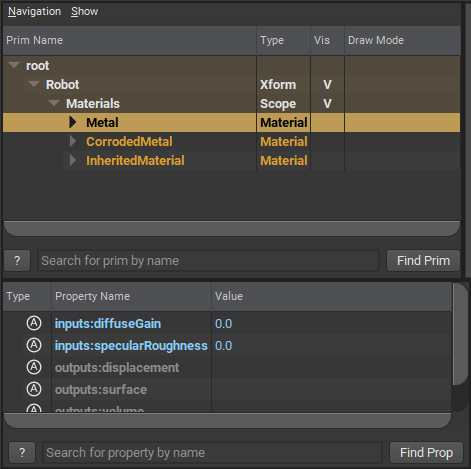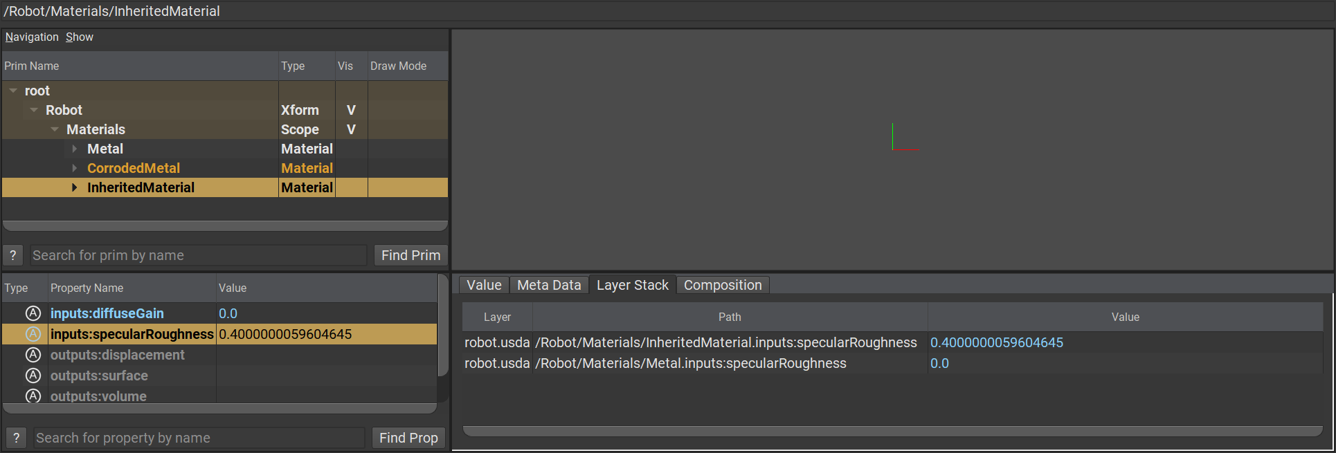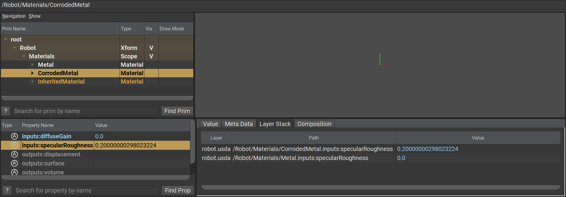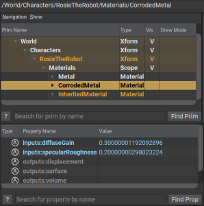 而在 world.usda 中,此圖層透過 reference 參照整併了 robot.usda 檔案,並且對已經存在著的源頭 Metal 提出了 Opinion 意圖覆寫它的基礎。其內部宣示了 inputs:diffuseGain 和 inputs:specularRoughness 皆須被變更為 0.3 與 0.1。